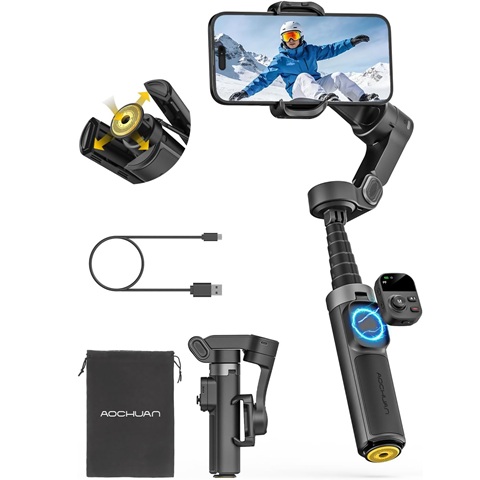 Amazon - AOCHUAN Smart X3 360° Pan Rotation Gimbal Stabilizer for iPhone, Magnetic Remote Control, 3-Axis Stabilizer w/Built-in Extension Rod & One-Touch Open Tripod, Foldable Phone Gimbal for Vlogging, Travel