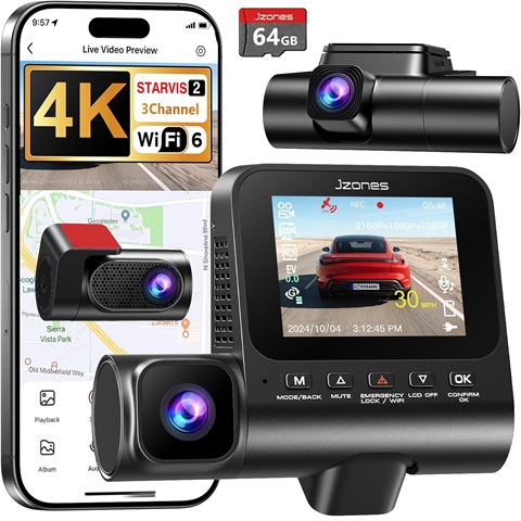Amazon - 4K 3 Channel Dash Cam Front and Rear, Dash Camera for Cars, STARVIS 2 Sensor Dash Camera with HDR Night Vision, 24H Parking Mode Car Camera with GPS, Loop Recording