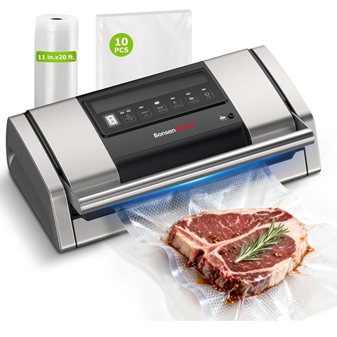 Amazon - Bonsenkitchen Vacuum Sealer for Food, Easy-Lock Handle Vacuum Sealer Machine with Bag Clip, Built-in Cutter and Bag Storage for Sous Vide and Meal Prep, 1 Roll Bag & 10 Pre-Cut Bags, Silver