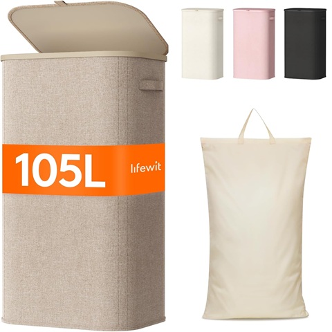 Amazon - Lifewit 105L Laundry Basket with Lid, Large Laundry Hamper with Plastic Handles and Removable Bag, Foldable Tall Dirty Clothes Hampers for Laundry for Laundry Room, Bedroom, Bathroom, Dorm, Beige