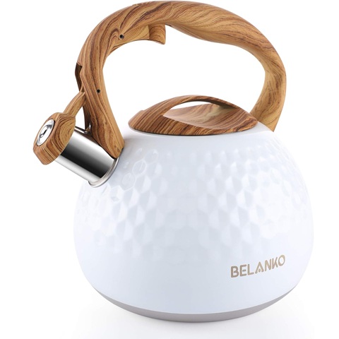 Amazon - BELANKO 2.7 Quart Tea Kettle for Stovetop - Food Grade Stainless Steel with Diamond Texture, Designer Teapot Look, Cool-Touch Wood Pattern Handle, Whistling Spout - Gloss White