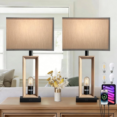 Amazon - Modern Farmhouse Table Lamps Set of 2 for Living Room, Entryway, Bedroom Nightstand - USB-A/C Charging Ports & 3 Color Temperature Adjustable, 4 LED Bulbs Included