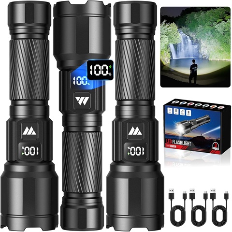 Amazon - 3 Pack Rechargeable Flashlights High Lumens, Super Bright LED Tactical Flashlight with LCD Power Display, Zoomable Flashlights 15H+ Runtime, IP65 Waterproof Flashlights for Home Emergency Camping