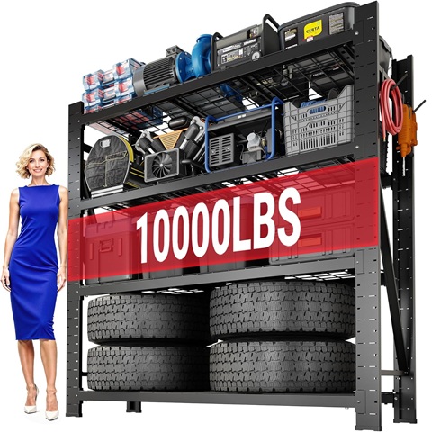 Amazon - FLEXIMOUNTS Garage Shelving Heavy Duty, 49.6'' W 4-Tier 10000LBS Industrial Shelving Unit with 4 Hooks, Adjustable Storage Shelves for Garage, Basement, Warehouse, 71'' H x 49.6'' W x 23.6'' D
