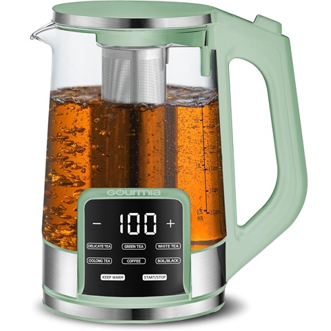 Amazon - Gourmia Electric Glass Kettle – 1.7L Programmable Tea & Coffee Brewer with Digital Touch Display, 6 Presets, Removable Stainless Steel Infuser, Cordless with 360° Swivel Base, Green