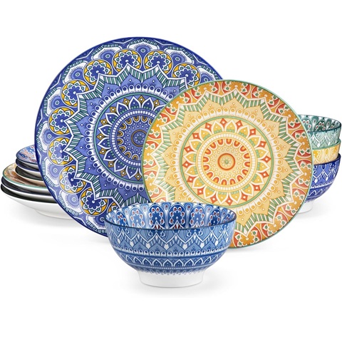 Amazon - vancasso Mandala 12 Pieces Dinnerware Sets, Porcelain Dinner Set for 4, Boho Plates and Bowls Set, Colorful Dish Sets