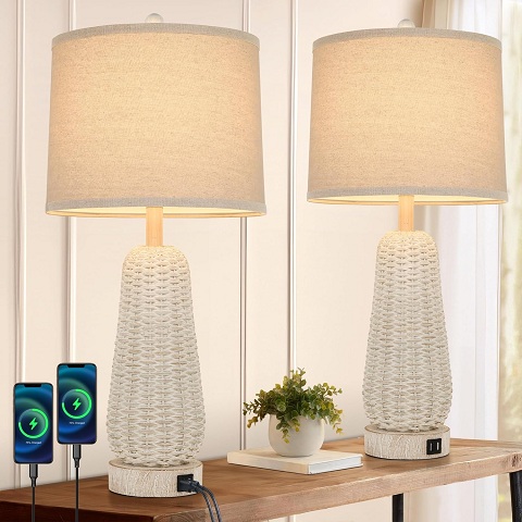 Amazon - 27 In Tall Wicker Table Lamp Set of 2 - White Rattan Table Lamp with 2 USB Fast Charging Ports, Beach Lamps with Linen Lampshade, Boho Bedside Lamps for Bedroom Nightstand, Living Room End Table