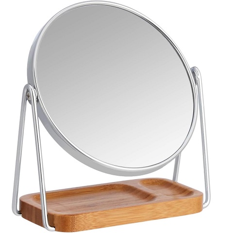 Amazon - Amazon Basics Vanity Round Tabletop Mount Mirror with Squared Bamboo Tray Magnification, Chrome, 7.2
