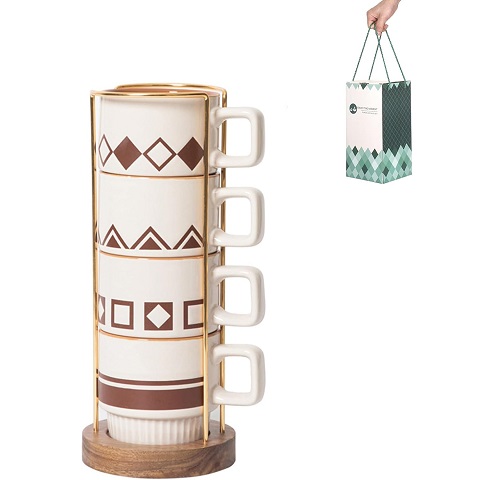 Amazon - Coffee Mugs Set of 4 with Acacia Wood Stand, 11 OZ Stackable Ceramic Coffee Mugs, Ceramic Tea Cups with Handle for Men Women, Tribal Geometry Series