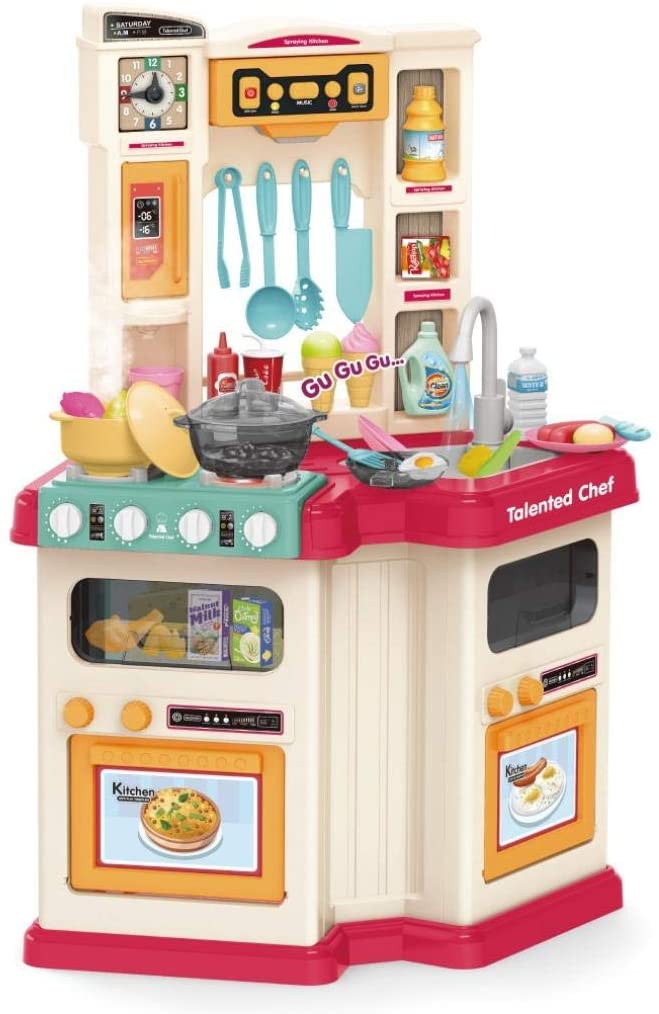 Amazon - 【US-in-Stock】 Kitchen Cabinet Playset, Kids Play Kitchen with Realistic Lights & Sounds,Simulation of Spray, Play Sink with Running Water,Dessert Shelf Toy Accessories for Girls Boys