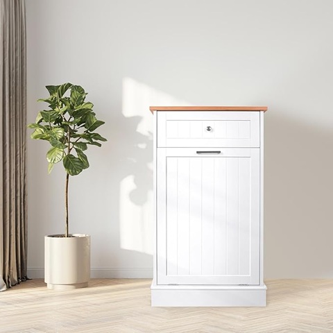 Amazon - Tilt Out Trash Cabinet 10 Gallon Kitchen Trash Can Holder Recycling Cabinet Laundry Hamper with Bamboo Cutting Board Hideaway Drawer Wooden with Added Countertop Space Keep Pets Out (White)