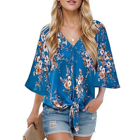 Amazon - Womens Casual Tie Front Tops Floral Dolman Tops 3/4 Sleeve V Neck Loose Fitted Boho Summer Blouse Shirt