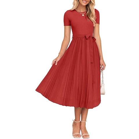 Amazon - ZESICA Womens Summer Short Sleeve Midi Dresses Spring Casual Crew Neck Knit Belted Pleated A Line Flowy Wedding Guest Dress